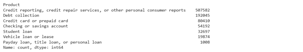 The product column in the dataset holds the labels, which represent the type of complaints reported by consumers. Let’s examine all the labels along with their frequencies: