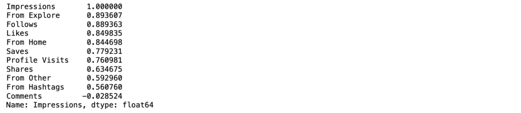 Let’s now analyze the number of comments correlates with the number of impressions on my Instagram posts.