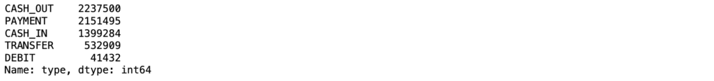 Dataset has no null values. Now, let’s check the type of transaction mentioned in the dataset: