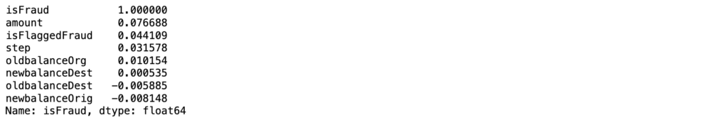 Now let’s explore the correlation between the features of the data with the isFraud column:
