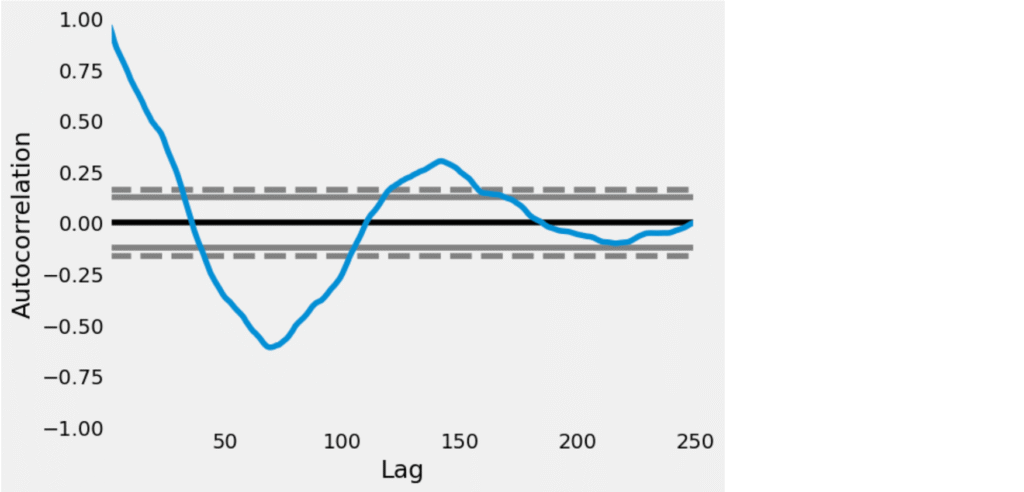 - x-axis (Lag): Number of lag periods (up to 250 here).