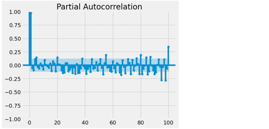 To apply ARIMA or SARIMA, we need to determine the values of p, d, and q. The p value can be identified using the partial autocorrelation plot of the Close prices, while the q value can be found using the autocorrelation plot. The d value is typically either 0 or 1, use 0 if the data is stationary and 1 if it’s seasonal. Since our dataset shows clear seasonality, we will use 1 as the value for d.