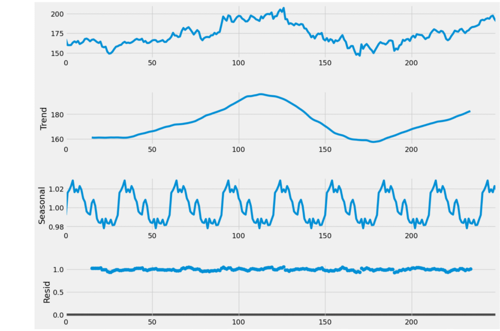 Before applying the ARIMA model, it’s important to determine whether the dataset is stationary or exhibits seasonality. The earlier visualization of closing stock prices indicates that the data is not stationary. To assess this more accurately, we can use seasonal decomposition, which breaks the time series into its trend, seasonal, and residual components. This helps provide a clearer understanding of the underlying patterns in the data before modeling.
